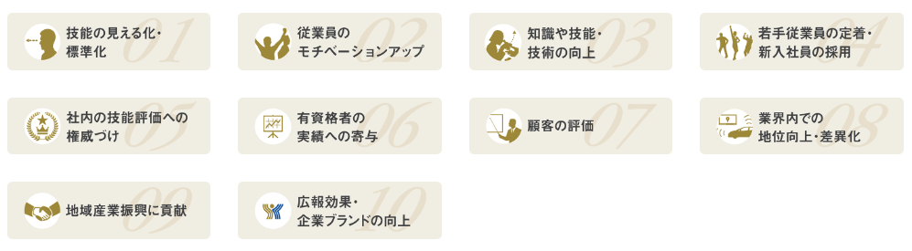 認定を受けることで、技能の見えるかや社員のモチベーョンアップ、顧客評価の向上など、さまざまなメリットが得られます。